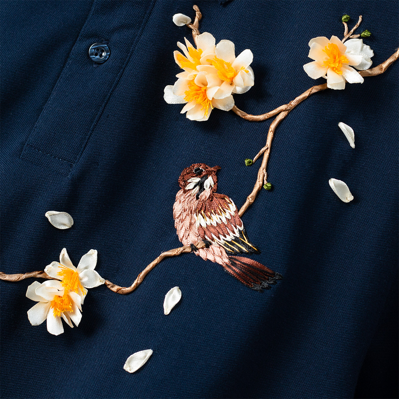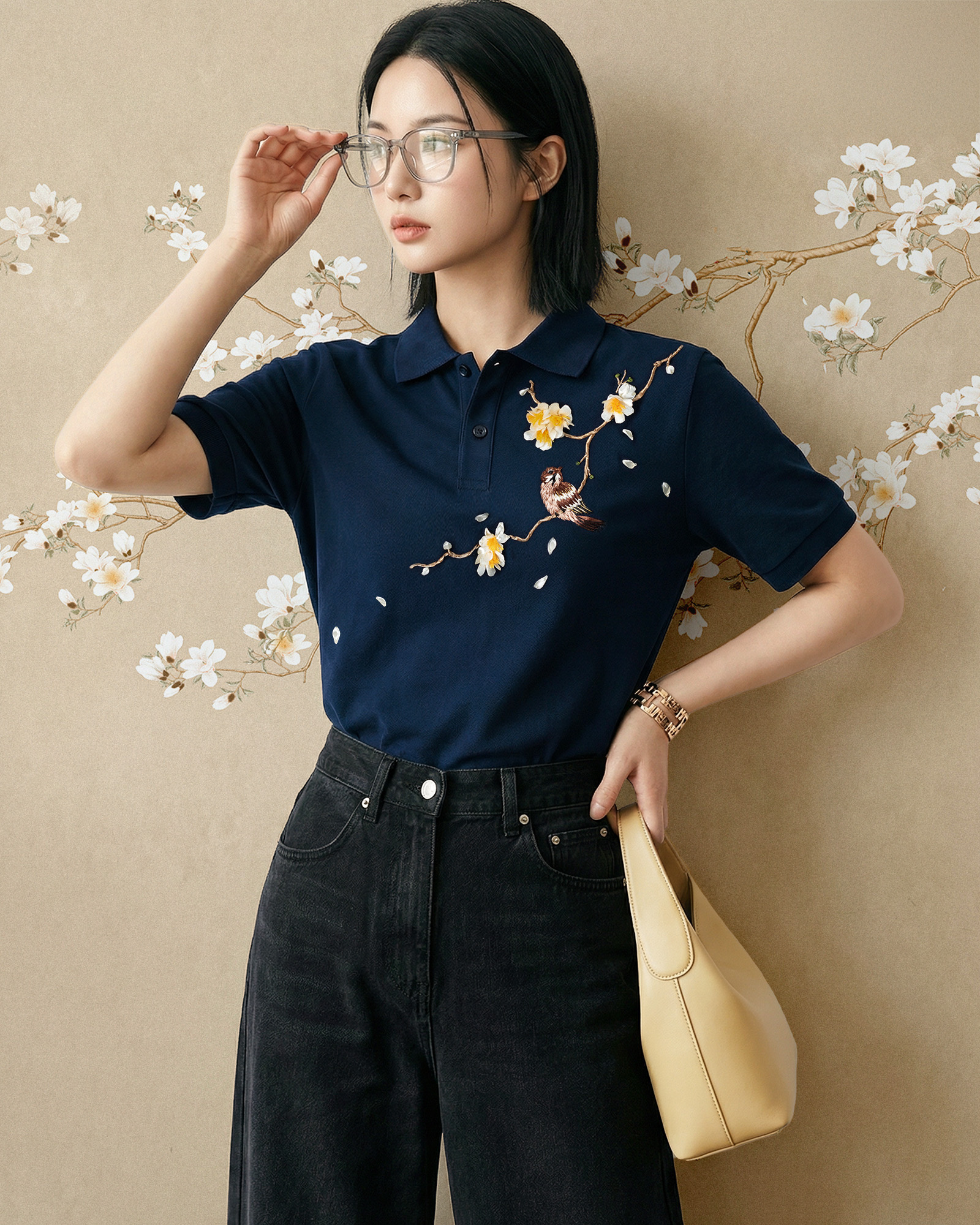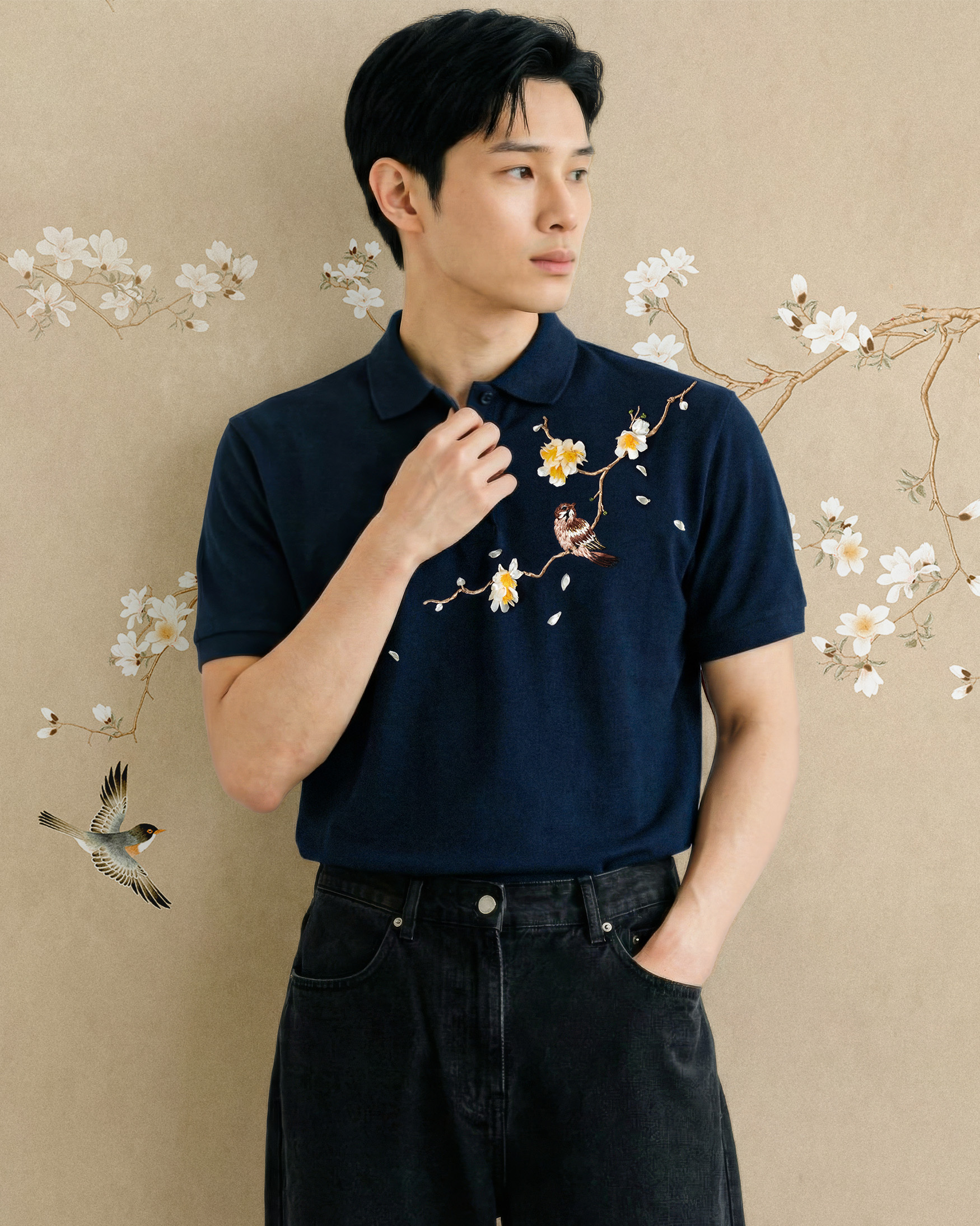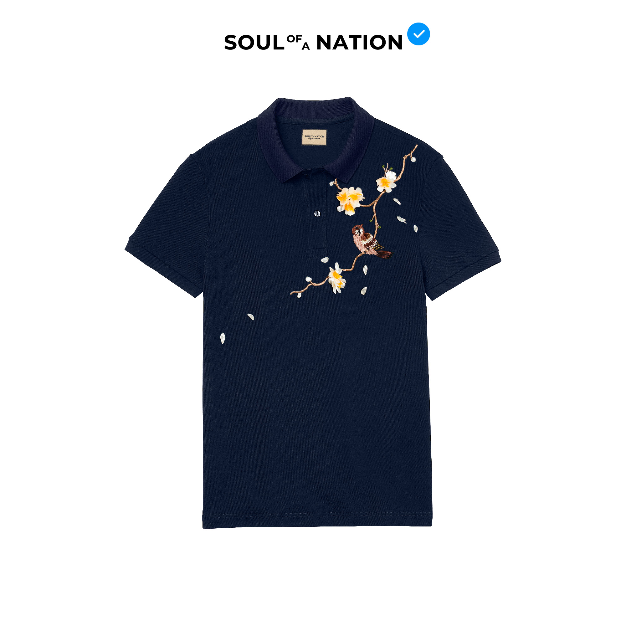 Áo Polo Thêu Ruy Băng Thủ Công - Chim Sẻ Nhành Mai 2025 Ưu đãi đặc biệt