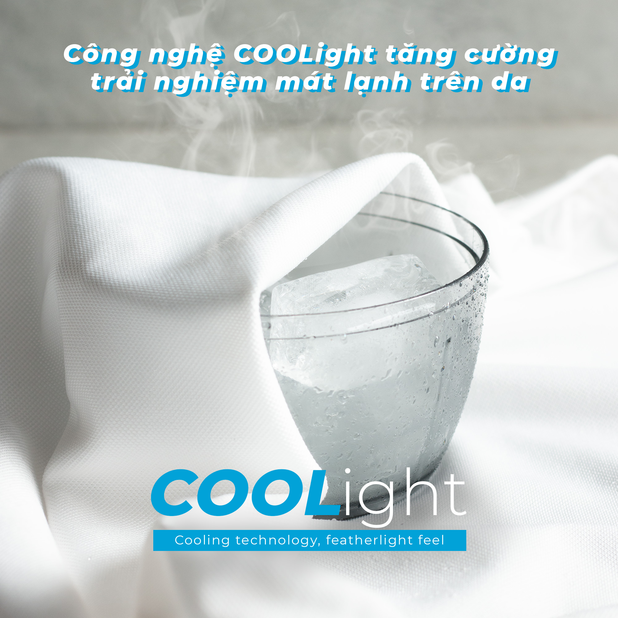 Công nghệ COOLight cho phép các sợi vải tản nhiệt nhanh, tạo hiệu ứng làm mát ngay khi tiếp xúc với da – một trải nghiệm rõ rệt ngay từ lần mặc đầu tiên.