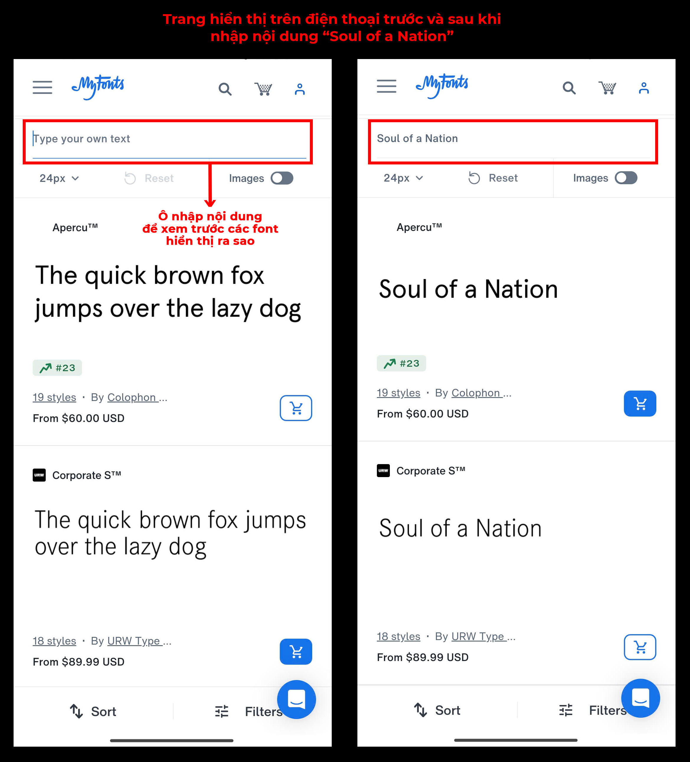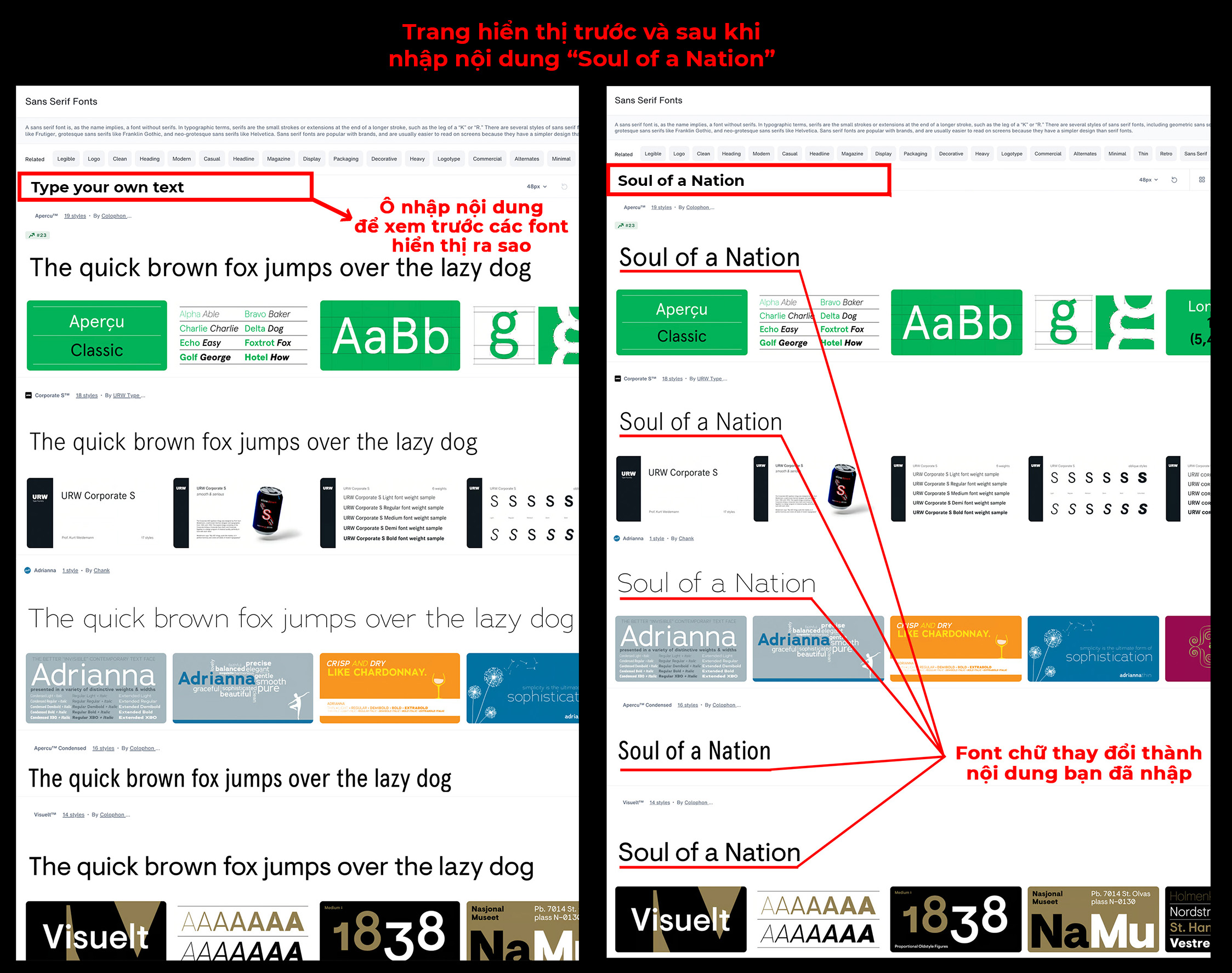 Cách thực hiện: Ví dụ bạn chọn kiểu font San Serif, sau khi nhấn vào bạn sẽ thấy danh sách các font không chân được liệt kê bên dưới. Tiếp tục nhập nội dung vào ô "Type your own text". Ví dụ nội dung là "Soul of a Nation", danh sách các font sẽ ngay lập tức đổi thành nội dung bạn đã nhập.