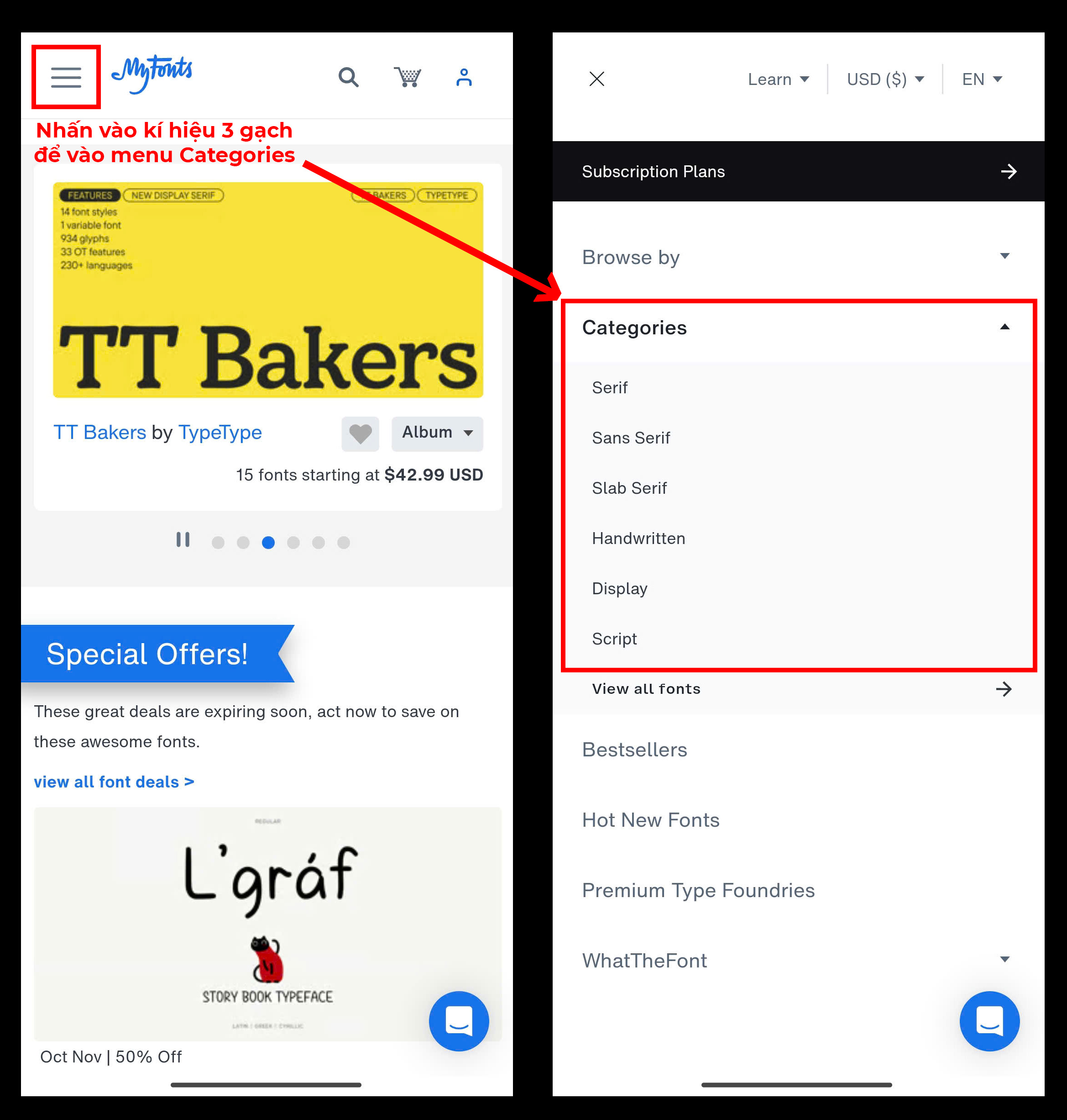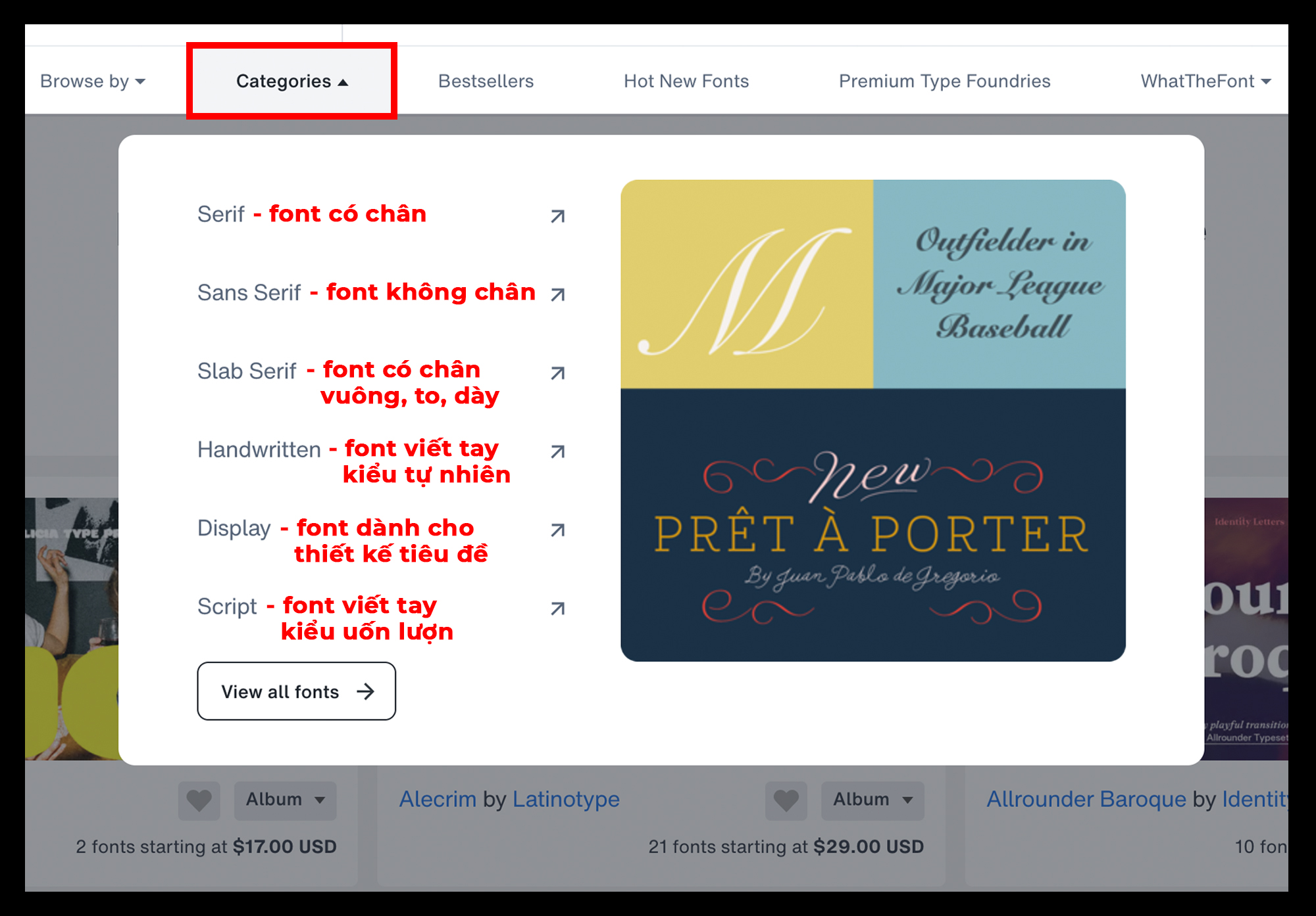Tại trang chủ MyFonts, nhấn vào menu "Categories", bạn sẽ nhìn thấy danh sách các kiểu font đã được MyFonts phân loại sẵn.