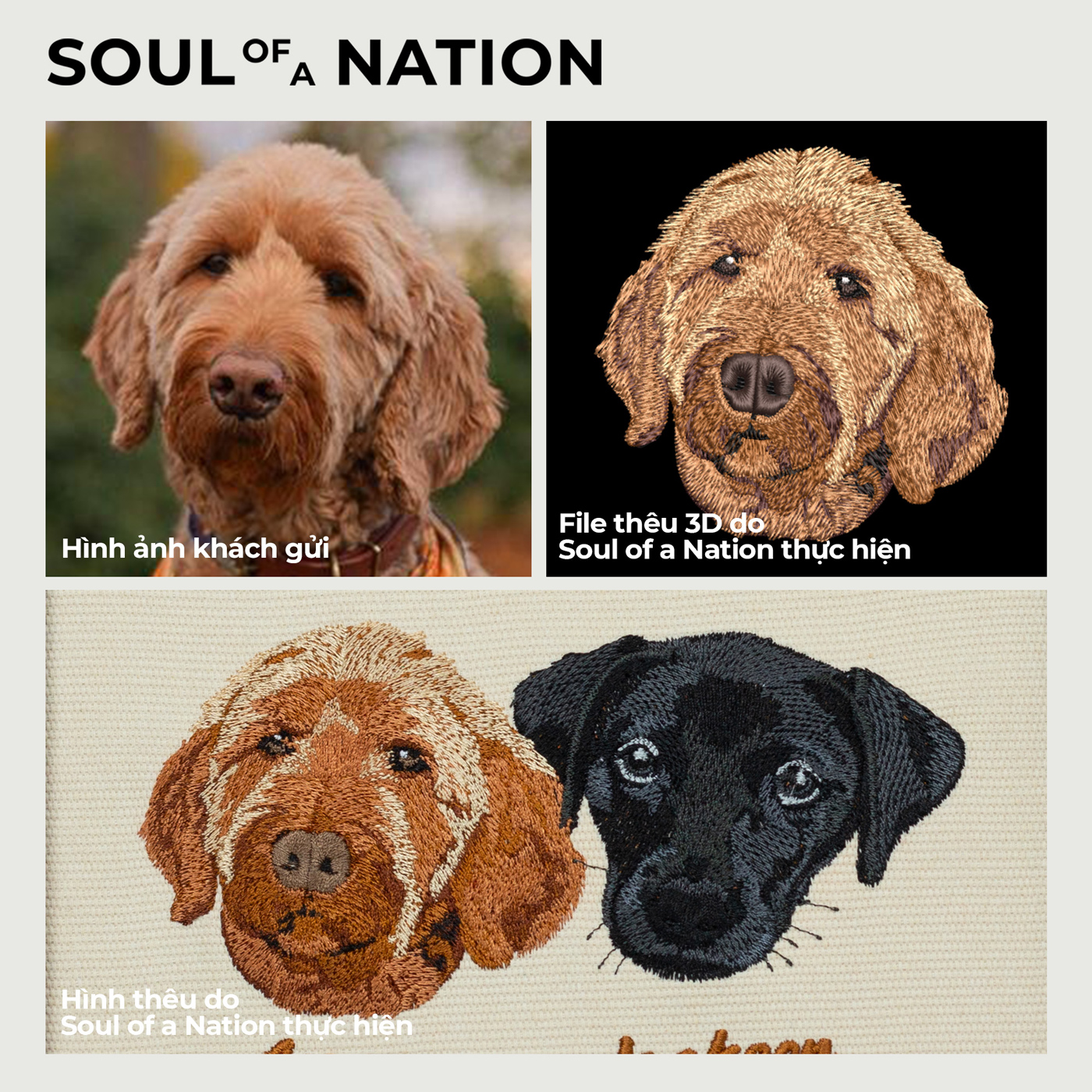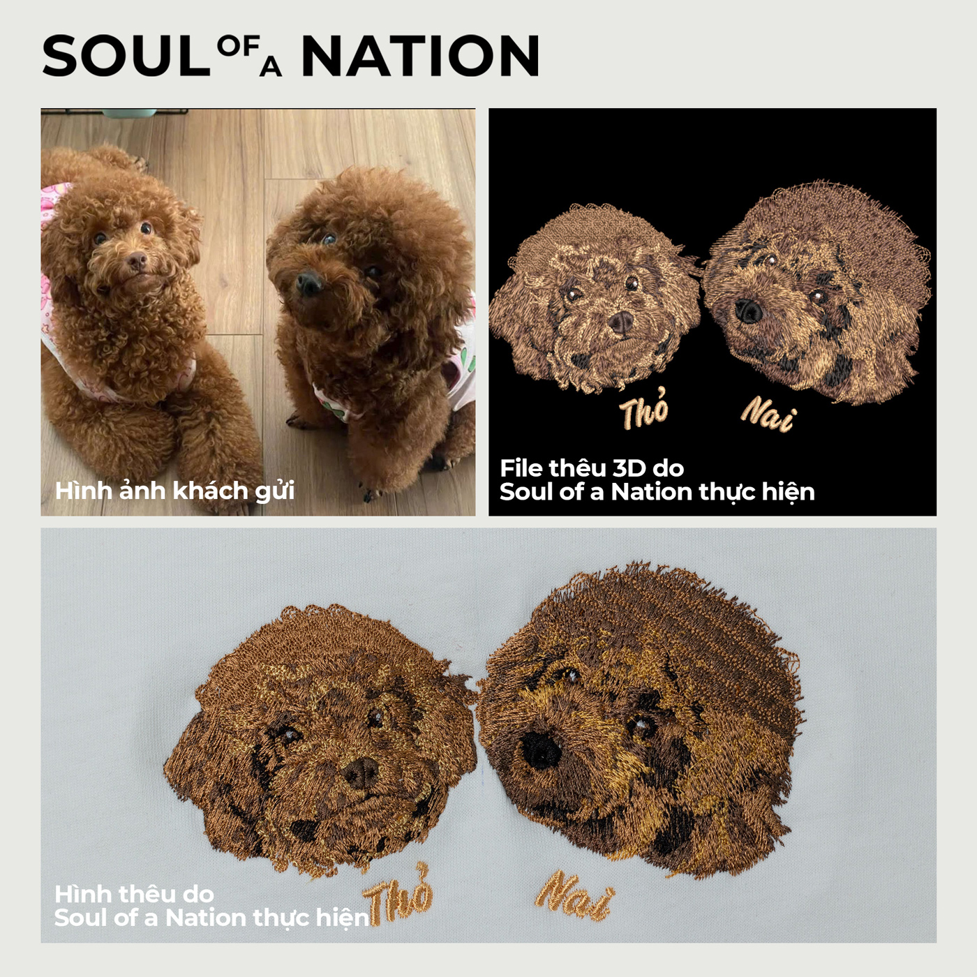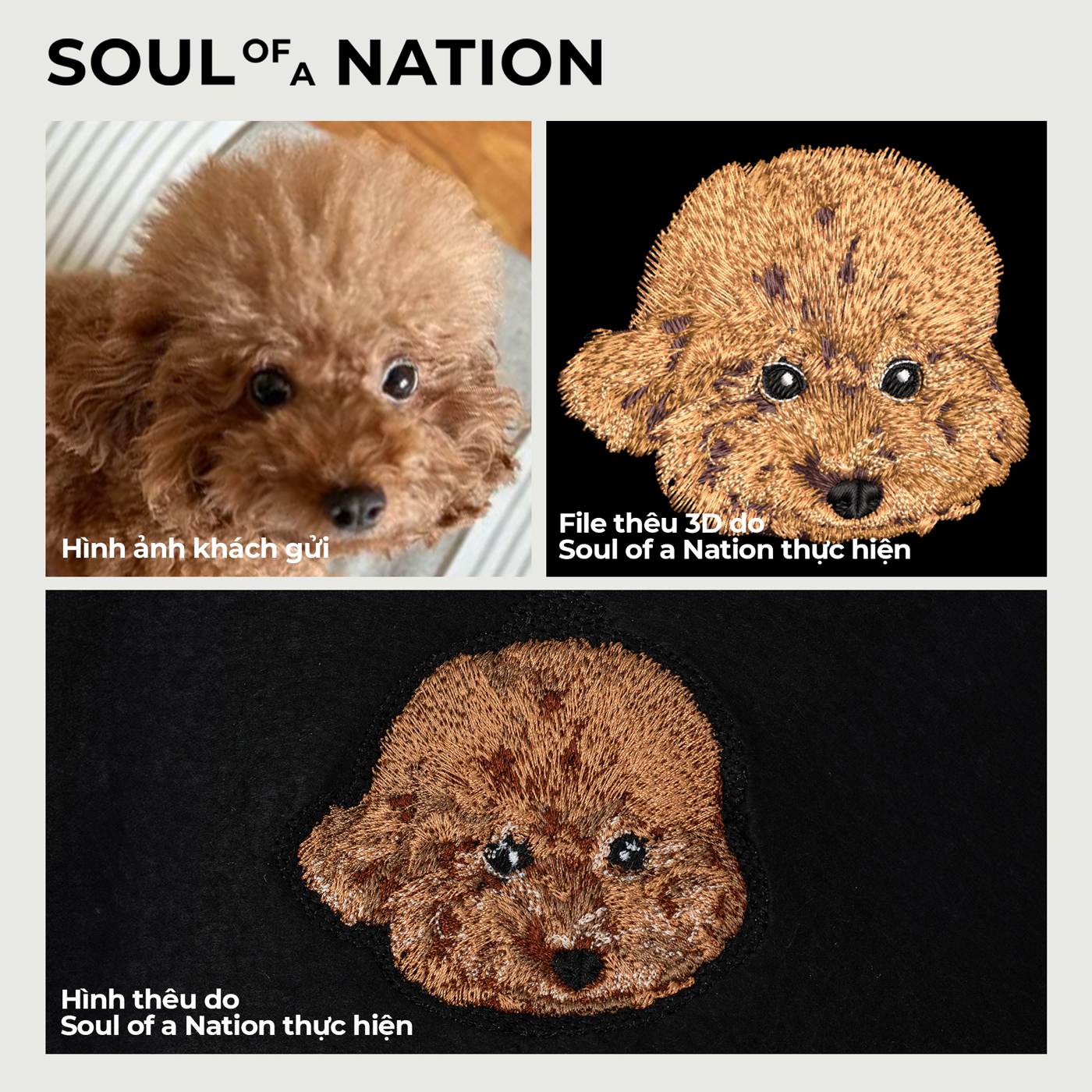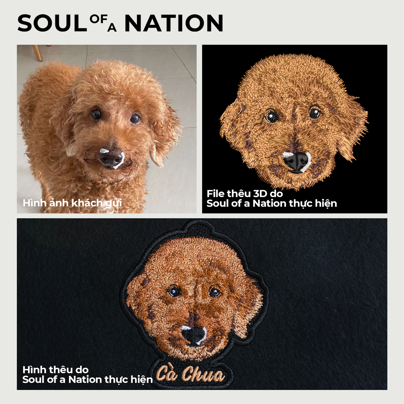 Soul of a Nation (SoN) xin chào bạn. Cảm ơn bạn đã quan tâm đến dịch vụ Thêu theo yêu cầu chân dung thú cưng tại SoN. Trong quá trình nhận thêu chân dung thú cưng, SoN nhận thấy giống chó Poodle thường có màu lông đặc biệt khó thể hiện chính xác 100% qua chỉ thêu, bắt nguồn từ vấn đề màu sắc trên hình ảnh của khách hàng gửi luôn có sự sai lệch so với màu sắc thực tế của thú cưng.