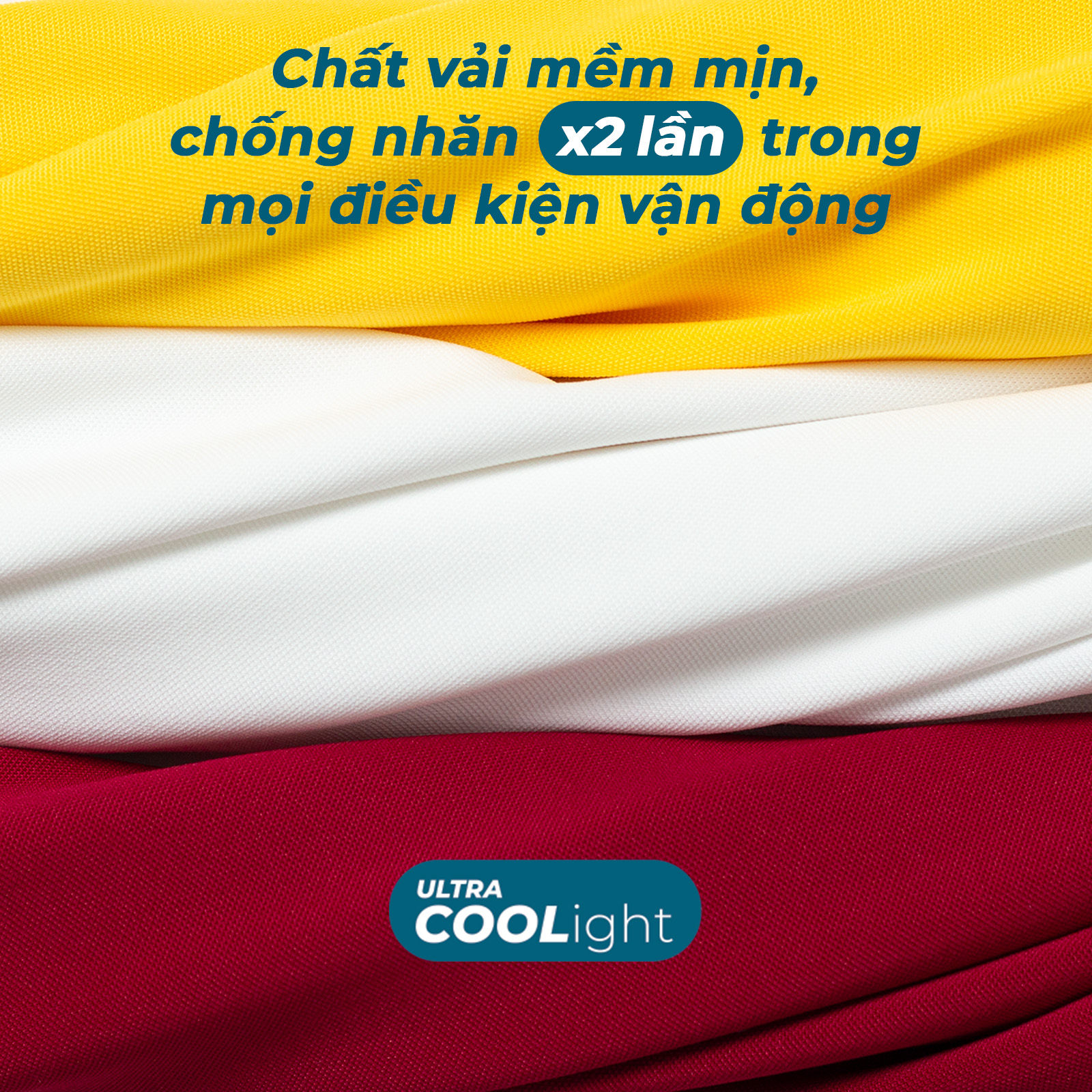 Vải Ultra COOLight có độ đàn hồi cao giúp tăng khả năng giữ form gấp 3 lần so với vải COOLight, không bai dão sau nhiều lần giặt – giữ áo bền đẹp cho thời gian sử dụng dài hơn.