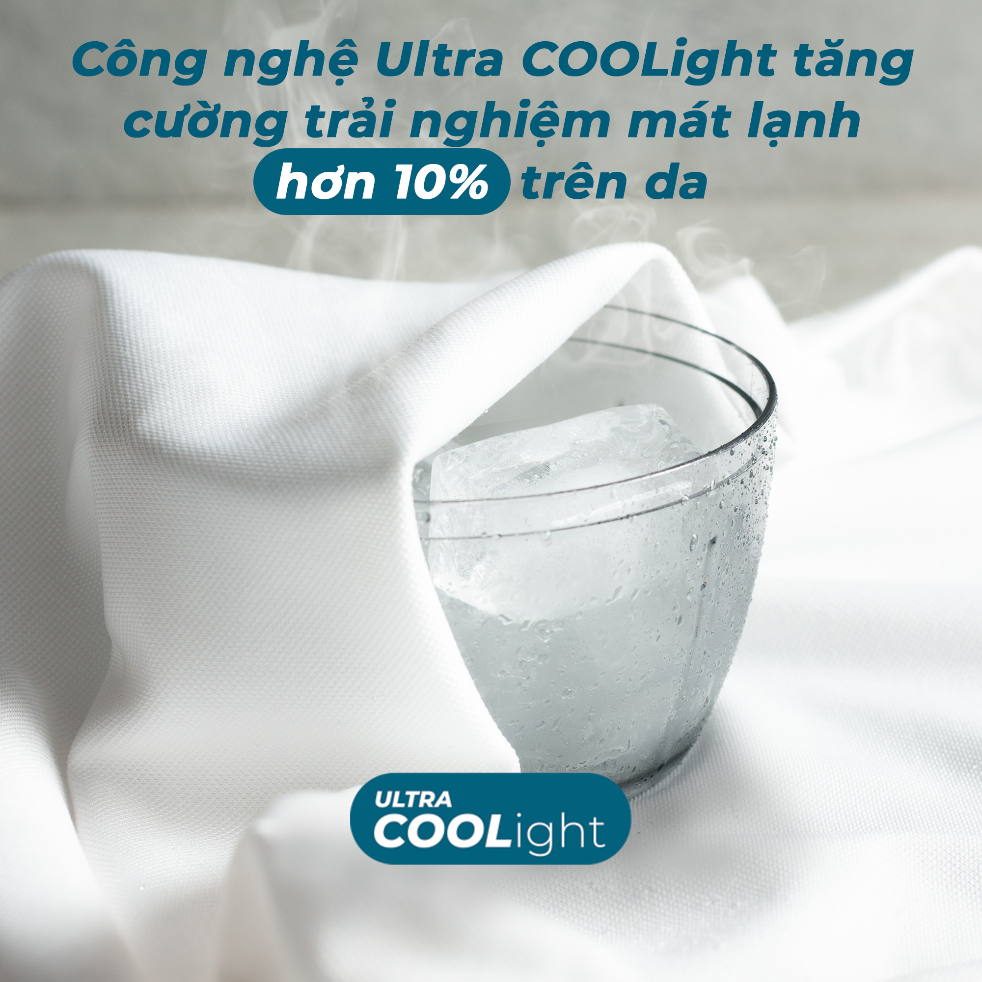 Công nghệ Ultra COOLight cải tiến cho phép các sợi vải tản nhiệt nhanh hơn, tạo hiệu ứng mát lạnh hơn 10% so với vải COOLight ngay khi tiếp xúc với da – một trải nghiệm rõ rệt ngay từ lần mặc đầu tiên.